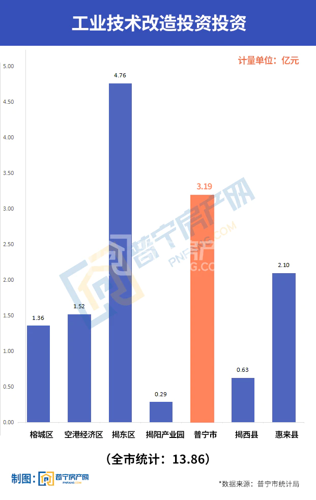 1-5月,揭阳全市工业技改投资13.86亿元,下降51.9%,降幅比1-4月扩大6.6个百分点。其中,揭东区以4.76亿元位居第一,普宁市以3.19亿元位居第二,惠来县以2.10亿元位列第三。