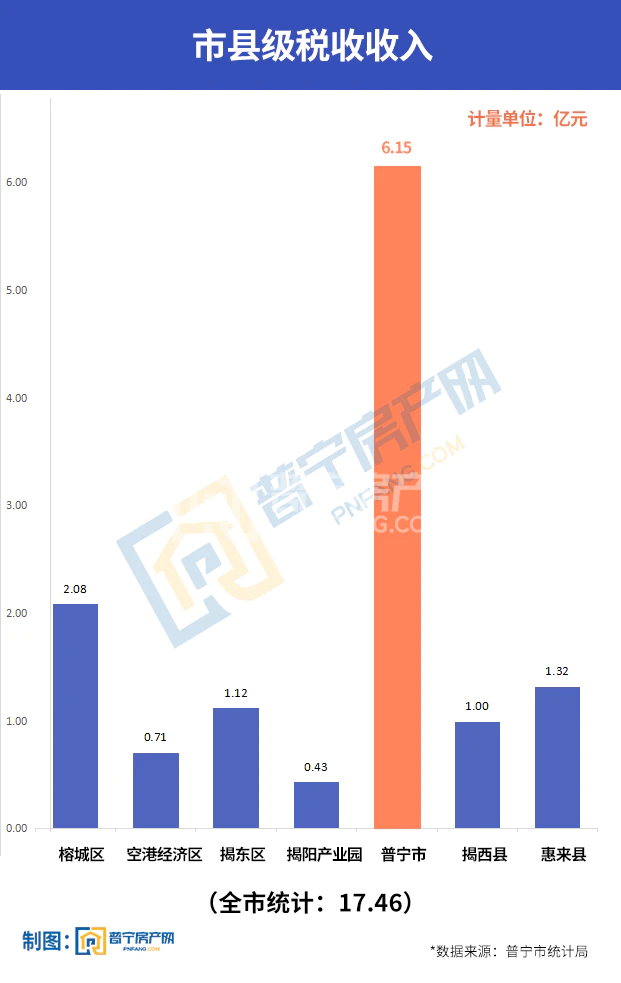 1-5月,揭阳全市市县级税收收入17.46亿元,增长19.5%。其中普宁市以6.15亿元位居第一,榕城区以2.08亿元位居第二,惠来县以1.32亿元位居第三。