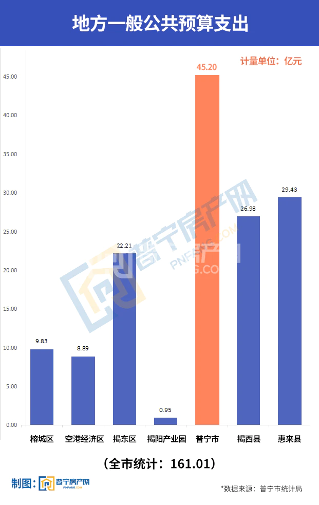1-5月,揭阳全市一般公共预算支出161.01亿元,增长0.5%。其中,普宁市以45.2亿元位居第一,惠来县以29.43亿元位列第二,揭西县以26.98亿元位列第三。
