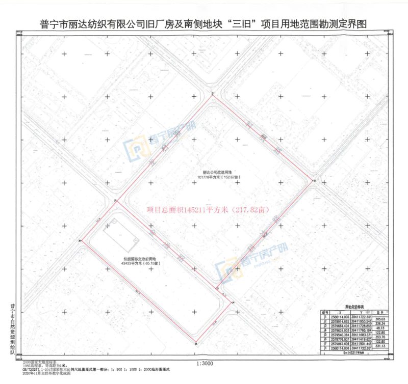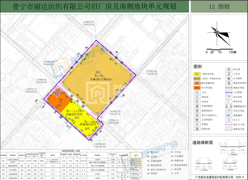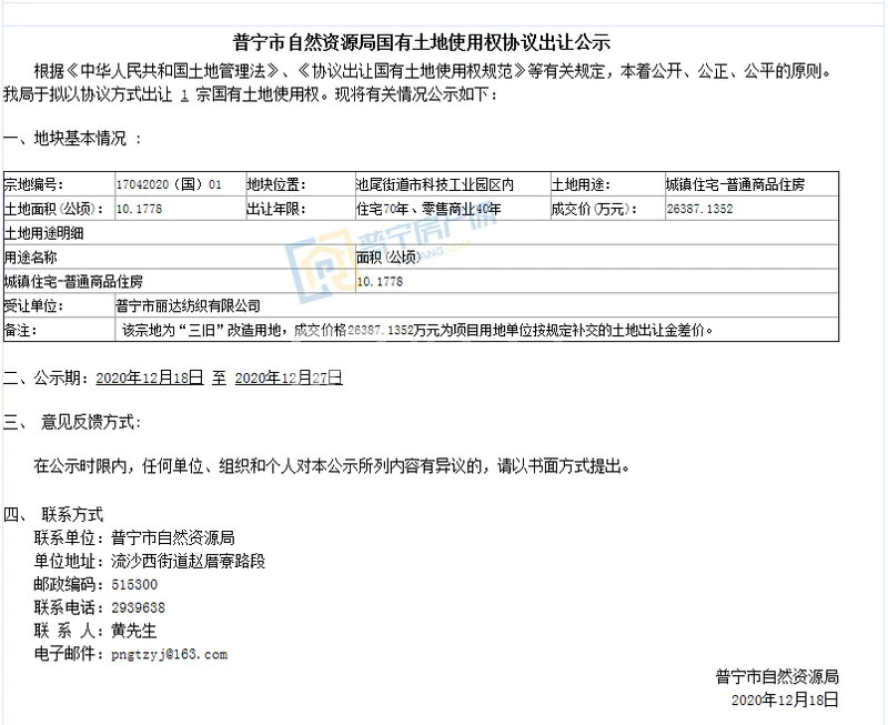普宁市丽达纺织有限公司旧厂房及南侧地块“三旧”改造方案公示,总占地面积217.82亩,其中自行改造面积为152.67亩,该宗土地改造后作为二类居住用地(兼容商业), 容积率≤4.5 (其中住宅≤4.2, 零售商业≤0.3) , 建筑密度≤35%, 绿地率≥35%,建筑高度≤90米;该项目其中按规定移交政府用地面积65.15亩,规划用途为服务设施用地、园区公共管理服务中心、中小学用地、二类住宅用地等。预计2021年开工,工期5年,计划2026年竣工。
