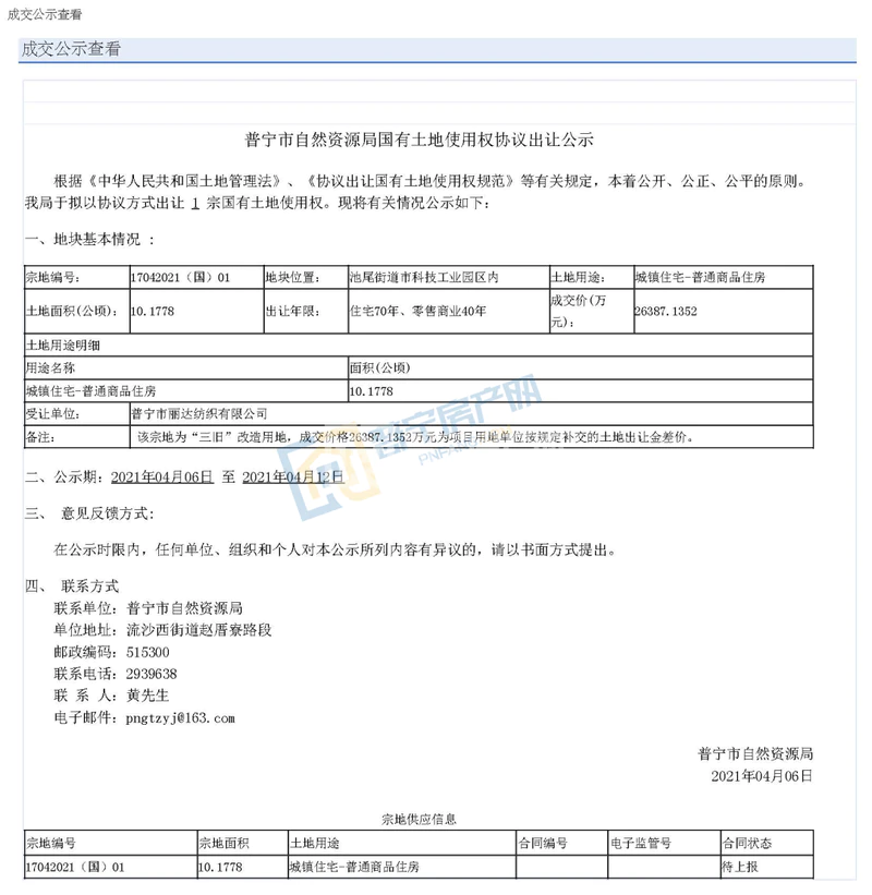 丽达三旧改造用地协议出让成交公示,土地面积152.67亩,成交价格26387.1352万元。