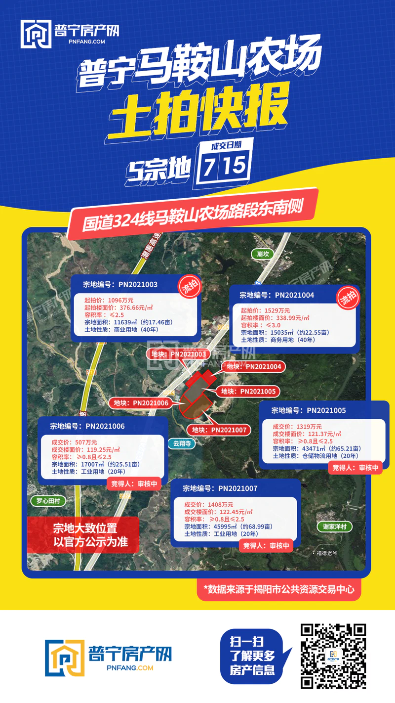 今天,7月的第一场土拍如约而至,位于国道324线马鞍山农场路段东南侧的五宗地块土拍结果出炉,其中两宗商业地块流拍,其余三宗均以底价成功出让,涵盖物流、工业用地,成功出让总面积约159.7亩,成交总价3234万。具体情况如下: