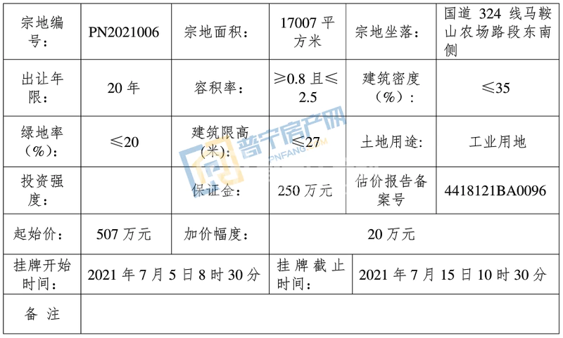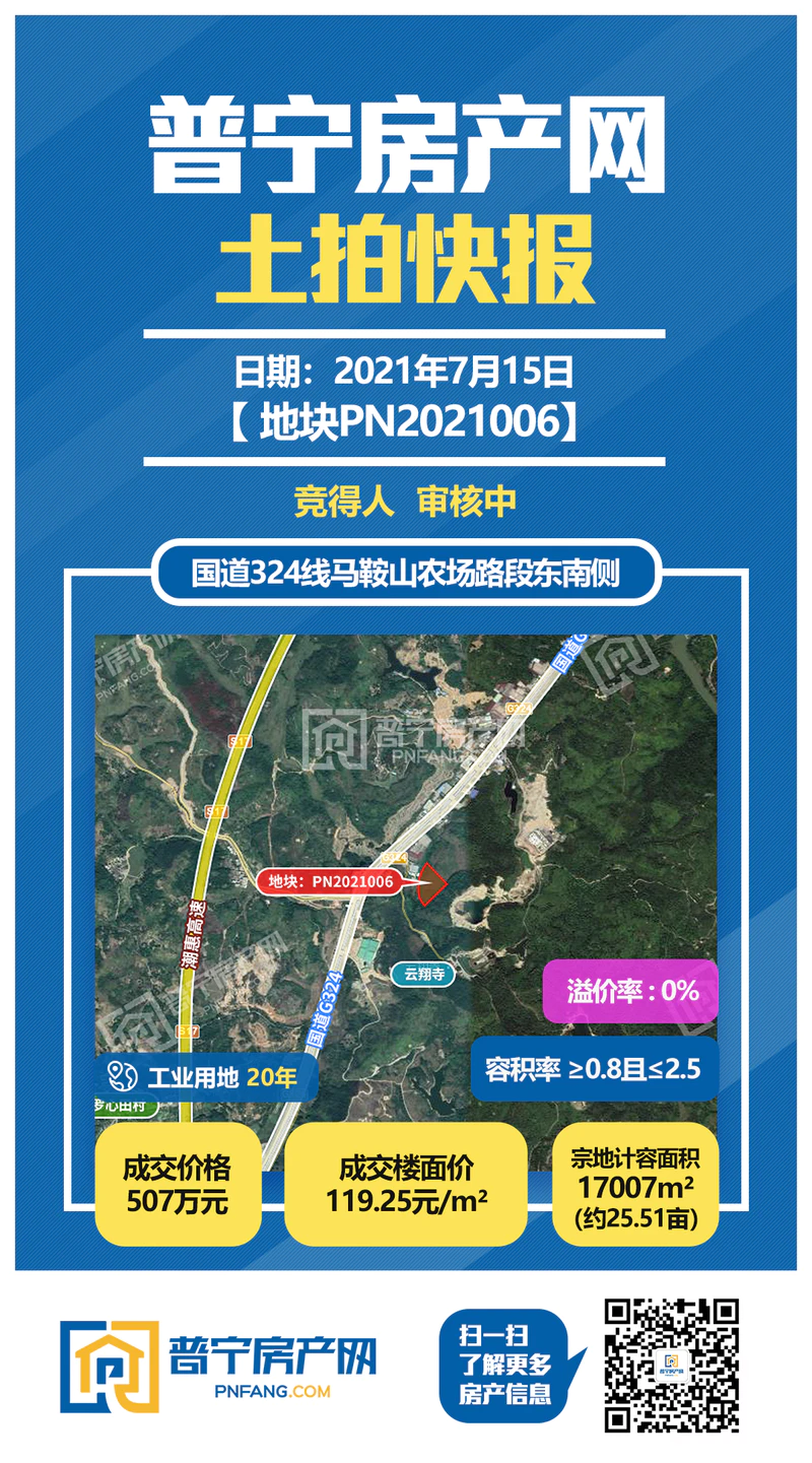 PN2021006地块成交总价507万,成交楼面价119.25元/㎡,占地面积17007平方米,为20年工业用地。