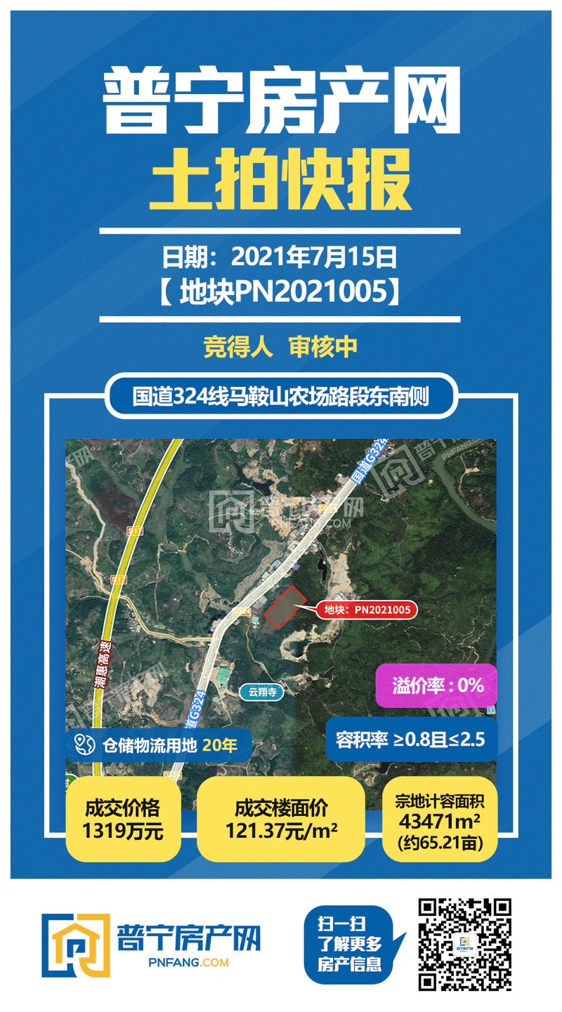 PN2021005地块成交总价1319万,成交楼面价121.37元/㎡,占地面积43471平方米,为20年仓储物流用地。