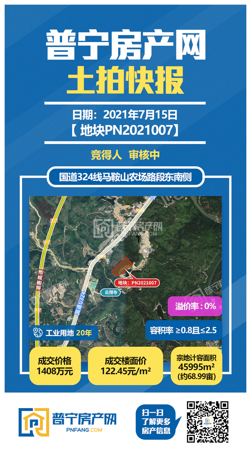 PN2021007地块成交总价1408万,成交楼面价122.45元/㎡,占地面积45995平方米,为20年工业用地。