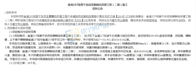 今天,省道237线普宁赤岗至麒麟段改建工程(二期)施工对外公开招标,将对旧路拓宽改建,双向四车道,全长16.854公里,计划工期18个月,具体内容如下:
