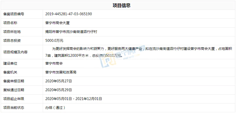 2020年5月,普宁市商会大厦备案通过。据了解,为更好发挥商会的影响力和凝聚力,更好服务两大健康产业,拟在流沙南街道泗竹仔(楼盘详情户型图相册地图)村建设普宁市商会大厦,占地面积7亩,建筑面积12000平方米,总投资5000万元。