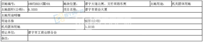 2021年4月,普宁市自然资源局国有土地划拨用地批前公示,划拨0.3333公顷土地用于建设普宁市商会大厦,受让单位为普宁市工商业联合会。