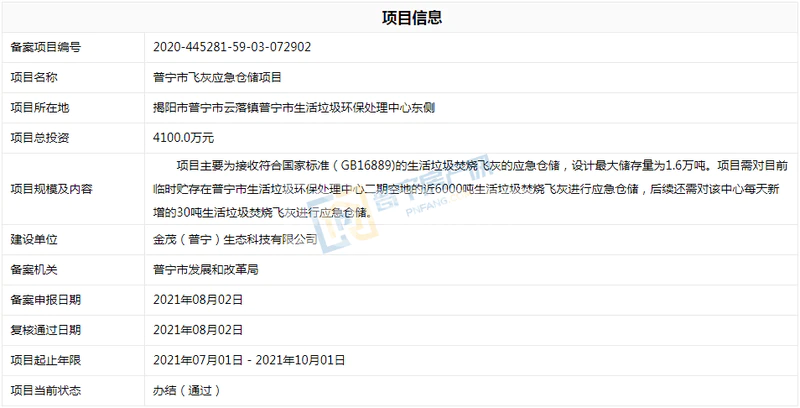 近日,小房君从相关平台了解到,总投资4100万的普宁市飞灰应急仓储项目正式备案通过,具体内容如下: