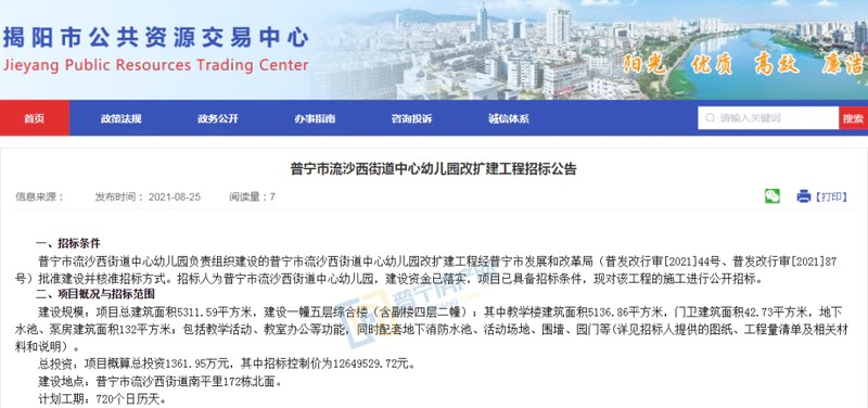 今天,小房君从揭阳市公共资源交易中心了解到,普宁市流沙西街道中心幼儿园改扩建工程对外招标,总投资1361.95万,将建设一幢五层综合楼,计划工期720个日历天。具体内容如下: