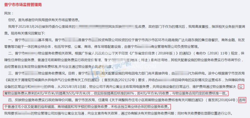 三、物业服务收费情况。目前,该项目相关配套设施的用电因电力部门尚未直接供电,由该项目代为转供电。该中心根据普宁市发改局《转发关于清理规范城镇供水供电供气行业收费有关工作的通知》(普发改函[2021]32号)要求,并结合项目转供电的实际情况及运营成本,为保障转供电设备的正常运行和供电,从2021年3月1日起,物业公司不再向公寓业主收取用电服务费,共用设施设备的日常运行、维护费用通过物业服务费解决;公寓物业服务费从原来的4元/平方米/月提高为5元/平方米/月,但实际按提高后标准的80%,即4元/平方米/月收费,与物业服务合同约定的收费标准一致。