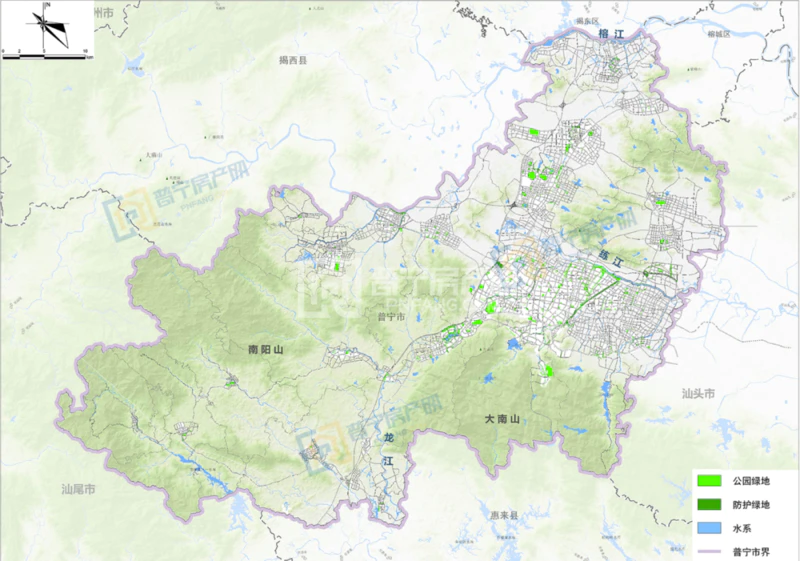 普宁市域规划绿地面积为23.1平方公里,其中规划建设公园绿地19.7平方公里,规划建设防护绿地3.4平方公里。中心城区规划绿地面积为16.5平方公里,其中规划建设公园绿地15.0平方公里,规划建设防护绿地1.5平方公里。