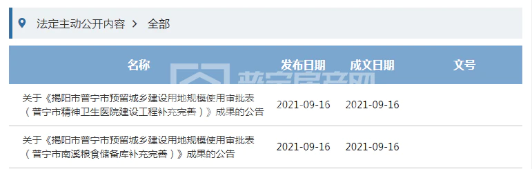 今天,普宁市自然资源局发布了两则关于普宁市预留城乡建设用地规模使用审批表成果的公告,涉及普宁市精神卫生医院建设工程、普宁市南溪粮食储备库两个民生项目。地块总面积0.9362公顷(约14亩),落实后全部调整为允许建设区。