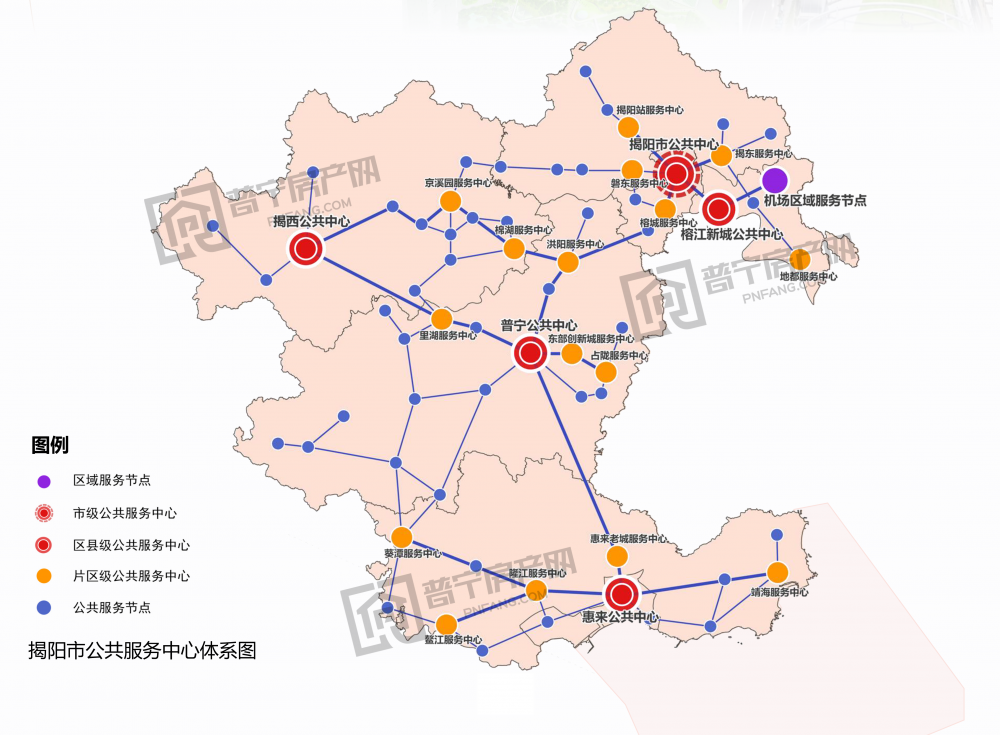 普宁中心城区列入“区县公共服务中心”,东部创新城、占陇镇、洪阳镇、里湖镇列入“片区级公共服务中心”,其他乡镇列入“公共服务节点”。