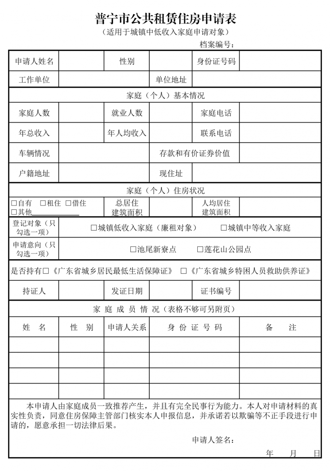 附件:1.《普宁市公共租赁住房申请表》(适用于城镇中低收入家庭申请对象)