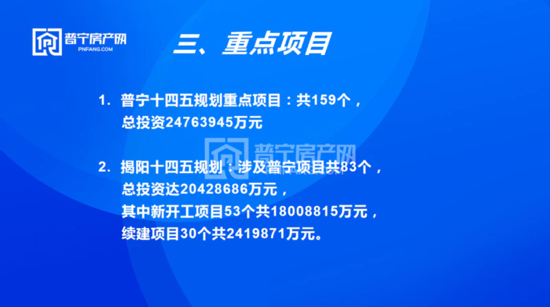 在普宁“十四五”规划中,重点项目共159个,总投资24763945万元。(相关链接:划重点!普宁十四五规划释放了哪些信号?你关心的都在这里!)