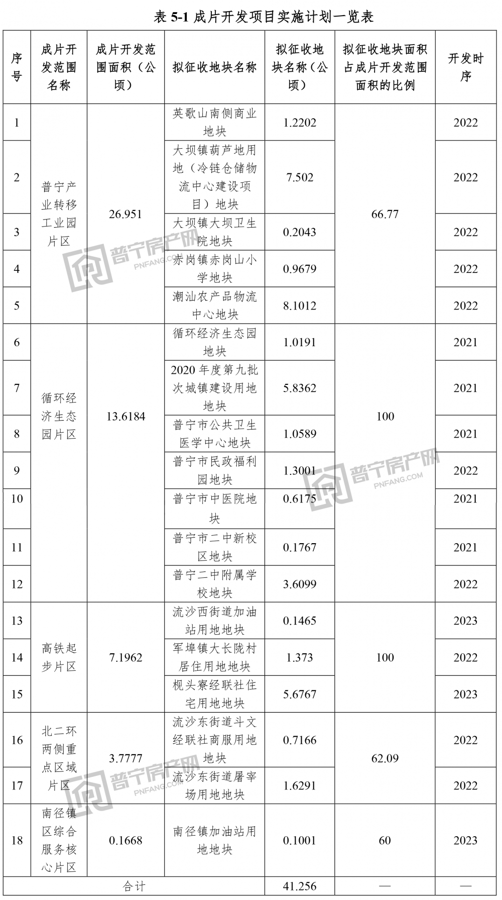 普宁市不存在大量批而未供或者闲置土地,土地利用效率较高。本次成片开发所涉及的项目已纳入国民经济和社会发展年度计划和在编国土空间规划确定的城镇开发边界预案的集中建设区,片区公益性用地比例为43.45%,不涉及占用永久基本农田和生态保护红线,符合土地征收成片开发标准。