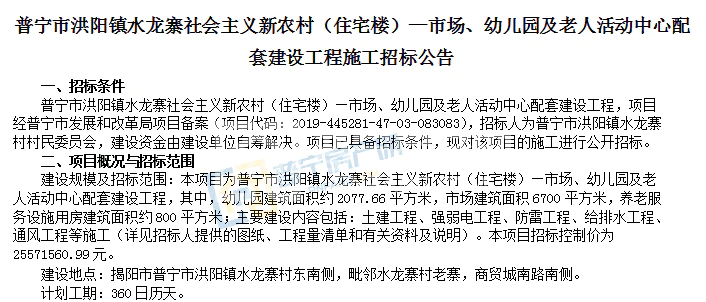 近日,普宁市洪阳镇水龙寨社会主义新农村(住宅楼)—市场、幼儿园及老人活动中心配套建设工程公开招标,招标控制价约2557万,计划工期360日历天,具体内容如下: