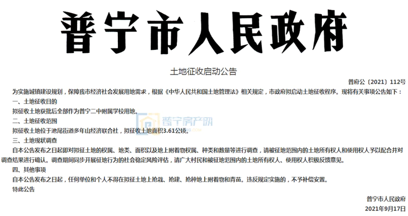 拟征收土地位于池尾街道多年山经济联合社,拟征收土地面积3.61公顷。获批后全部作为普宁二中附属学校用地。