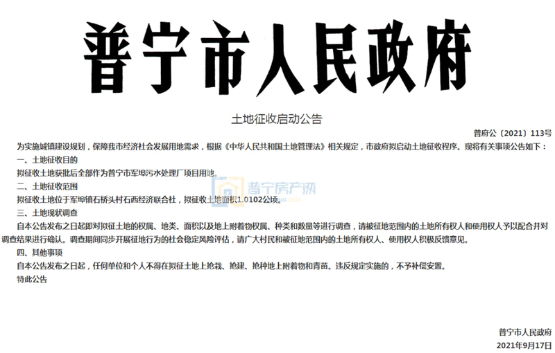 为实施城镇建设规划,保障我市经济社会发展用地需求,近日市政府发布了三则土地征收启动公告,分别位于池尾(楼盘详情户型图相册地图)街道多年山、军埠镇石桥头村、下架山镇横溪村郑家村,合计96.4亩,获批后分别作为普宁二中附属学校、普宁市军埠污水处理厂项目、普宁市下架山水质净化厂项目用地。具体内容如下: