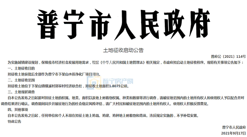 拟征收土地位于下架山镇横溪村郑家村经济联合社,拟征收土地面积1.8075公顷。获批后全部作为普宁市下架山水质净化厂项目用地。