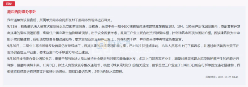 近日,普宁有业主通过相关平台反映尚堤中央(楼盘详情户型图相册地图0663-2559559)一期小区C栋首层业主违建,希望该违建能及时处置。流沙西街道办事处于10月25日对此进行了回复,要求首层三户业主现拟以最迟后天,2天内拆除水泥顶棚。具体内容如下: