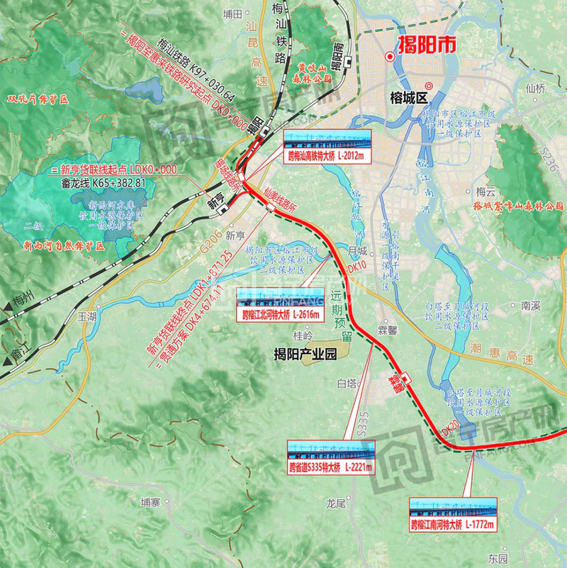 (2)建设规模:新建揭阳至惠来铁路位于广东省揭阳市境内,起自梅汕铁路揭阳站,经揭东区、揭西县、普宁市、惠来县,终于在建汕汕铁路惠来站。同步修建新亨联络线、揭阳联络线、大南海港区联络线及中石油专用线。新建揭阳至惠来铁路正线长度88.511公里。其中新建正线桥梁32.199公里/32座,隧道长26.618公里/12座,路基长29.684公里,桥隧比63.62%。新建揭阳、霖磐、洪阳、普宁北、普宁、大南山(楼盘详情户型图相册地图)、惠来、大南海等8 个车站,新建仙美、新亨、惠来西3个线路所。新建新亨联络线1.502公里;新建揭阳联络线1.565公里;新建大南海支线3.625 公里;新建中石油广东石化专用线5.391公里;共计12.083公里(单线)。本项目投资估算总额约132.78亿元,项目建设工期为4年。