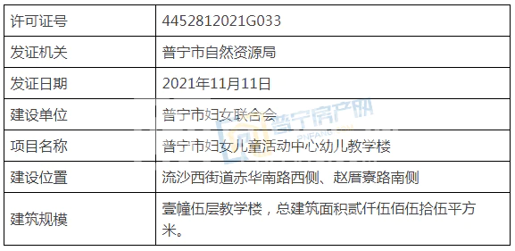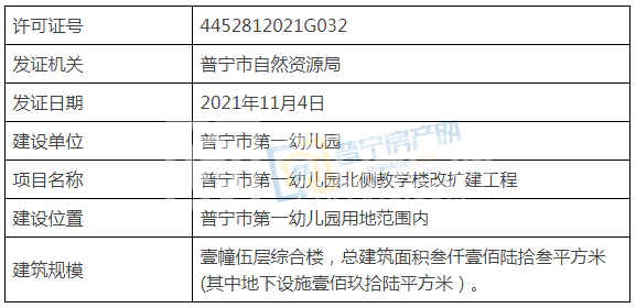 近日,据小房君了解,普宁盛世华府(楼盘详情户型图相册地图0663-2559559)1、2、3幢住宅楼已竣工验收,总建筑面积约148.3亩,另外还有妇女儿童活动中心幼儿教学楼、第一幼儿园北侧教学楼改扩建工程也进行批后公示,各建设1幢5层教学楼,具体内容如下: