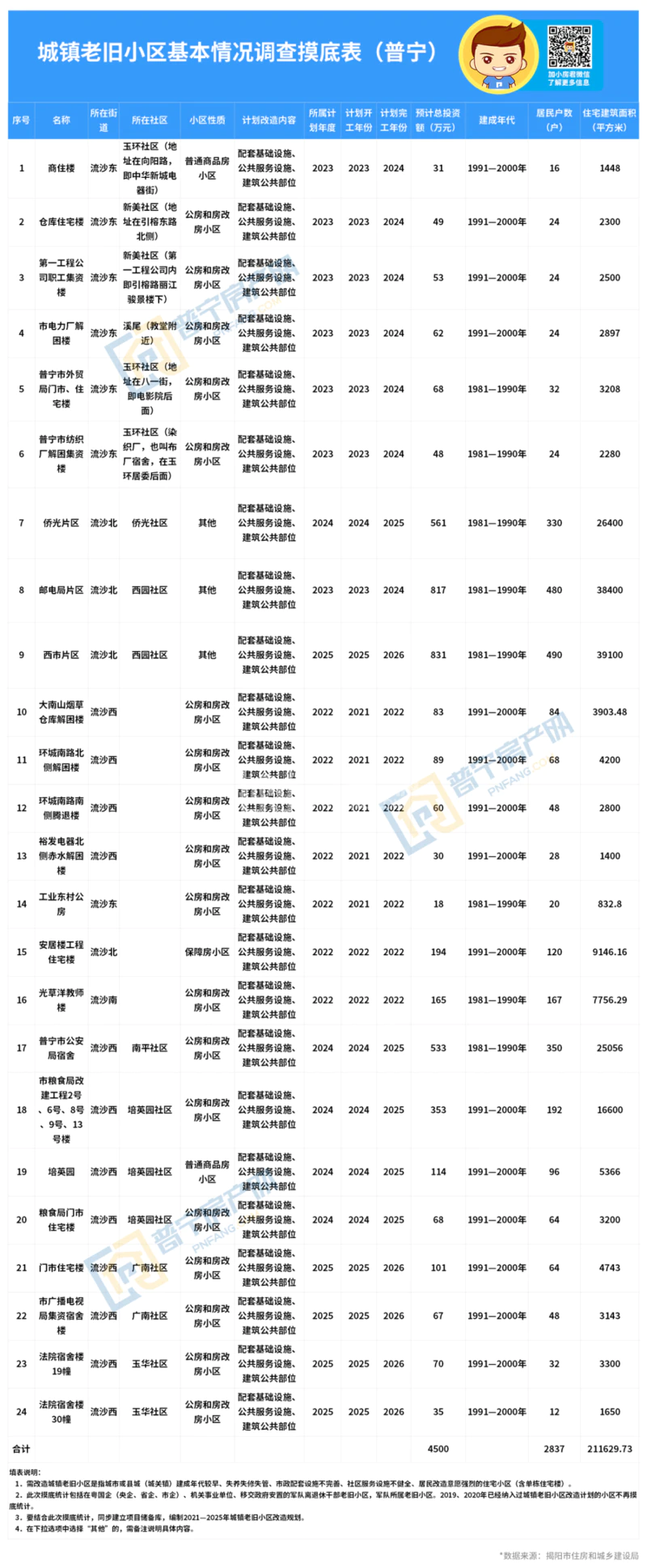 据小房君统计,普宁市有24个老旧小区需要改造,计划投资约4500万元,涉及总户数2837户,总建筑面积约211629.73平方米。其中2021年计划启动5个,2022年计划启动2个,2023年计划启动7个,2024年计划启动5个,2025年计划启动5个。计划改造内容均为配套基础设施、公共服务设施、建筑公共部位。一起来了解下:
