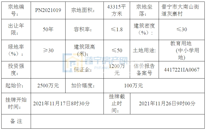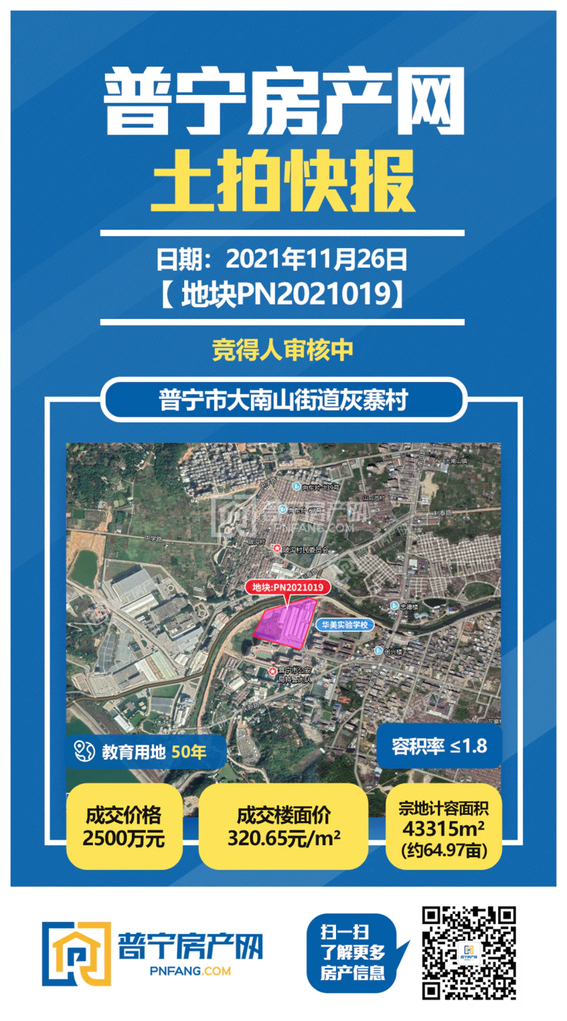 PN2021019地块以2500万成交,成交楼面价320.65元/㎡,地块位于普宁市大南山(楼盘详情户型图相册地图)街道灰寨村,占地面积43315平方米,为50年教育用地(中小学用地)。