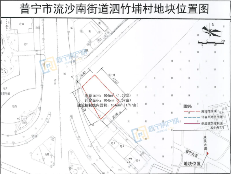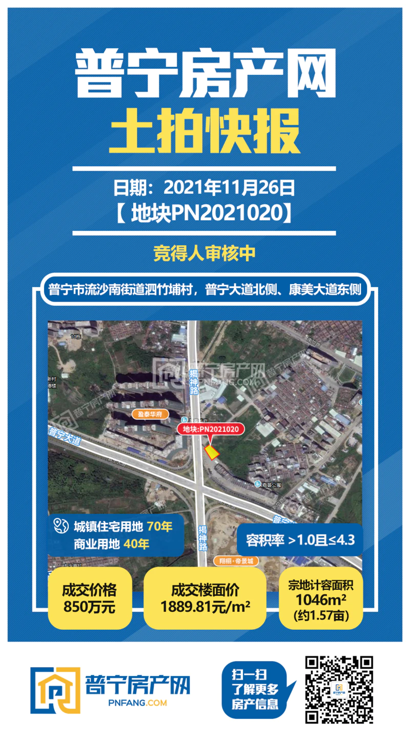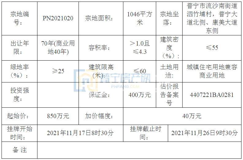 PN2021020地块以850万成交,成交楼面价1889.81元/㎡,地块位于普宁市流沙南街道泗竹埔(楼盘详情户型图相册地图)村,普宁大道北侧、康美大道东侧,占地面积1046平方米,为70年城镇住宅用地兼容40年商业用地。
