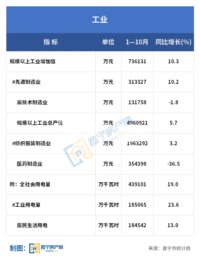 1-10月,全市完成规模以上工业增加值73.61亿元,增长10.3%,增速比去年同期加快9.4个百分点,两年平均增长5.5%。