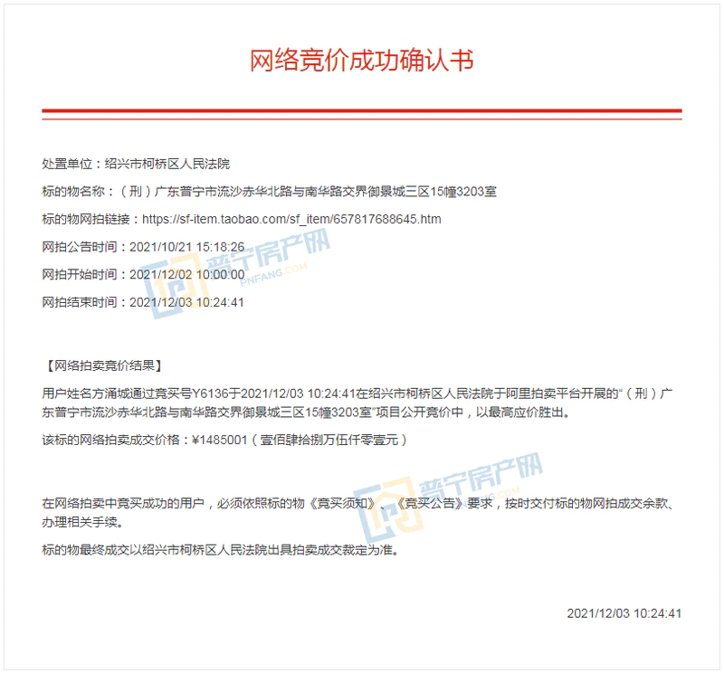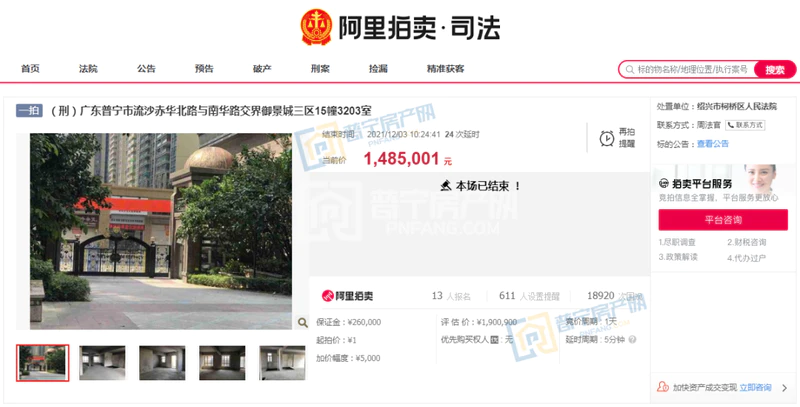 12月2日上午10点,一套位于普宁市流沙赤华北路与南华路交界御景城三区15幢3203室的房源,在阿里拍卖平台上,以1元的价格正式开拍。经过一天的竞拍周期,今天上午10点拍卖结束,参与竞拍人数13人,611人设置提醒,围观次数高达1.9万人次,最终经过89轮竞价,延时24次后,最终以148.5万的价格成交,低于市场评估价约41.5万。