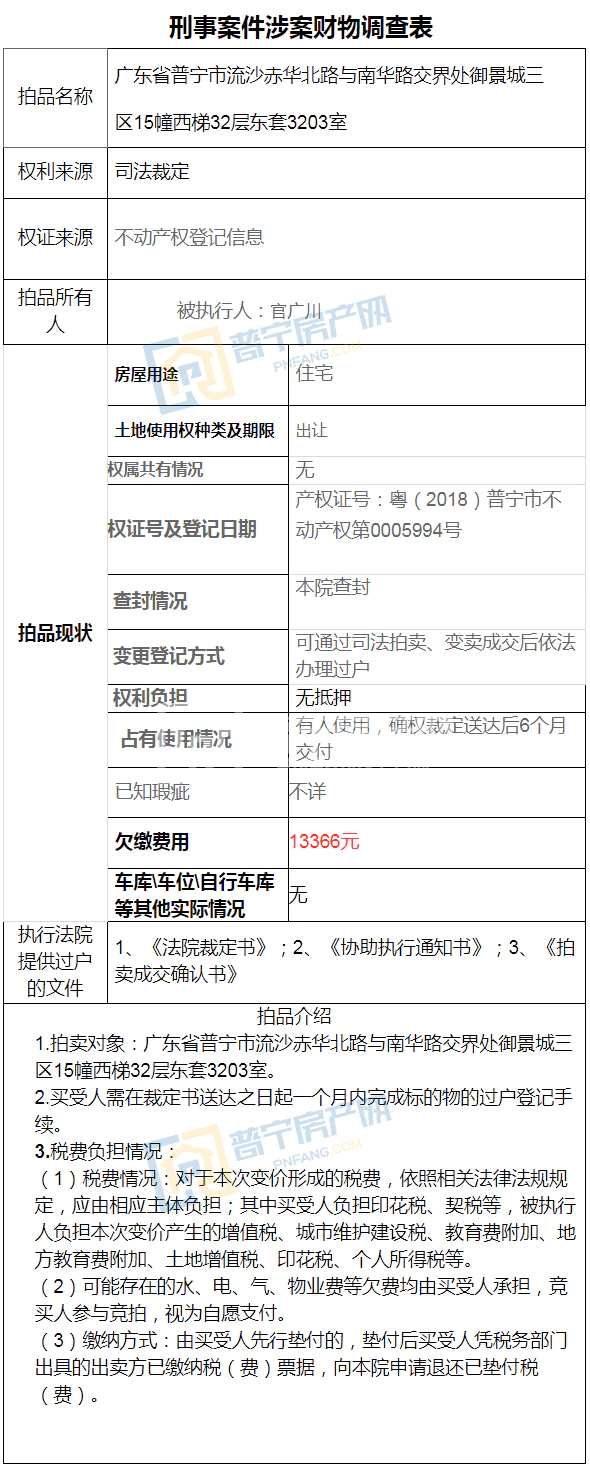 拍卖标的物位于普宁市御景城三区15幢西梯32层东套3203室。总层数:34层,(其中:地上层数:32层,地下层数:2层),标的物建筑面积180.01平方米。截止2021年7月31日,尚欠物业管理费11881元,专项维修基金1485元,所欠费用一共为13366元,由买受人承担。评估价为1900900元。