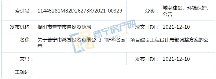 关于普宁市鸿发投资有限公司“新华名园”项目 建设工程设计局部调整方案的公示