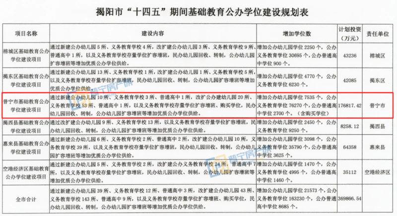 据小房君了解,“十四五”期间普宁市基础教育公办学位建设项目,计划投资176817.42万元,通过新建公办幼儿园10所、义务教育学校3所、普通高中1所,改扩公办建幼儿园20所、义务教育学校53所、普通高中1所,以及义务教育学校存量学位扩容增班、购买学位,民办幼儿园回收、转制,公办幼儿园扩容增班等增加优质公办学位供给。增加公办幼儿园学位7535个,公办义务教育学位76270个,公办普通高中学位2700个。(含购买学位)