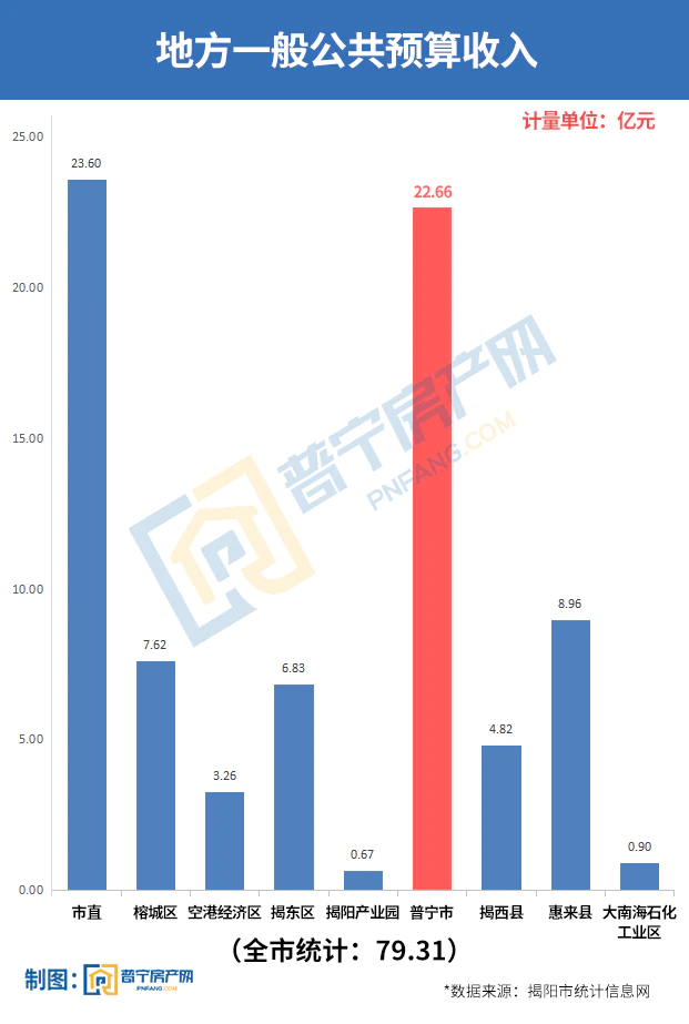 财政收入较快增长。2021年揭阳全市实现地方一般公共预算收入79.31亿元,增长7.2%。其中,市直以23.6万位居第一,普宁市以22.66亿元位居第二,惠来县以8.96亿元位居第三。