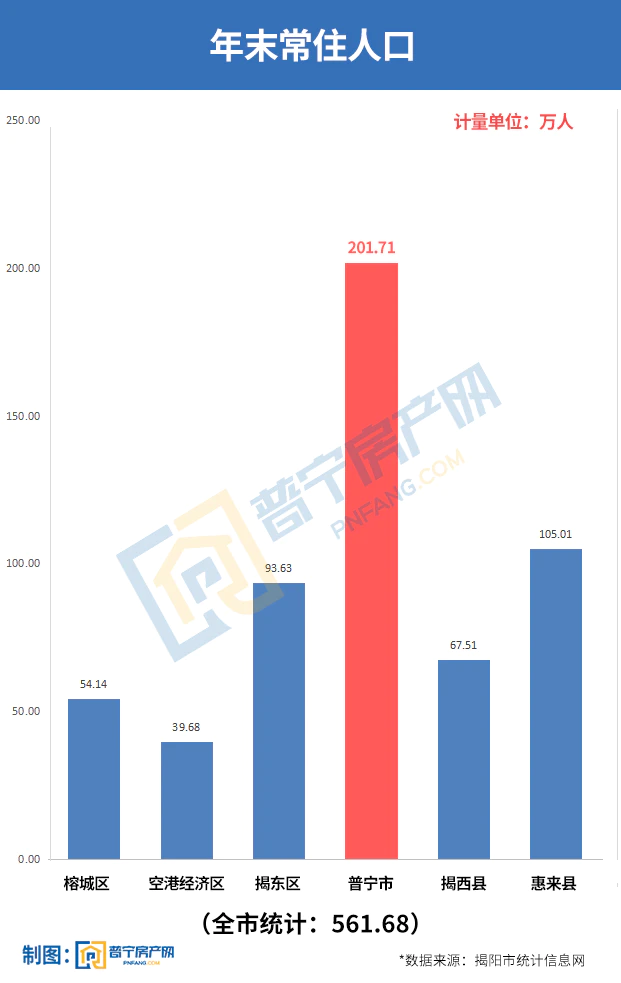 2021年末揭阳全市常住人口561.68万人,增长0.68%。其中,普宁市以201.71万人位居第一,惠来县以105.01万人位居第二,揭东县以93.63万人位居第三。