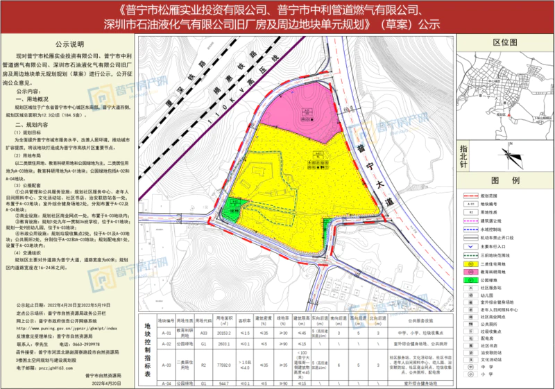 现对普宁市松雁实业投资有限公司、普宁市中利管道燃气有限公司、深圳市石油液化气有限公司旧厂房及周边地块单元规划规划(草案)进行公示,公开征询公众意见。