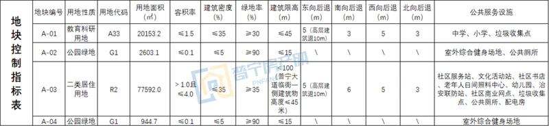 ③教育设施:规划1处九年一贯制36班学校,位于A-01地块;规划一处9班幼儿园,位于A-03地块;