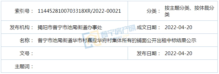 普宁市池尾街道华市村嘉应华府村集体所有的铺面公开出租中标结果公示