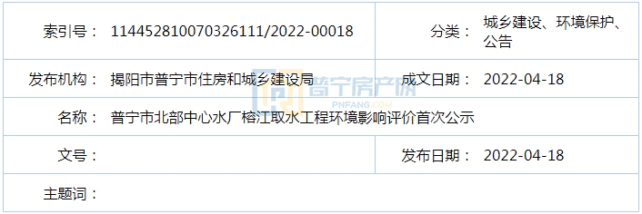普宁市北部中心水厂榕江取水工程环境影响评价首次公示