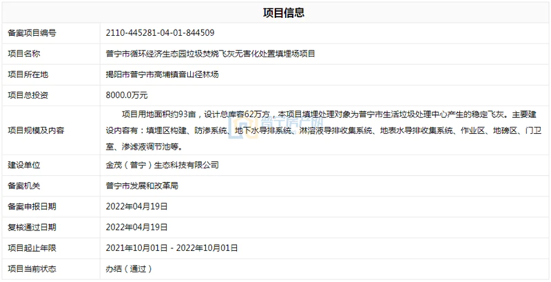 普宁市循环经济生态园垃圾焚烧飞灰无害化处置填埋场项目
