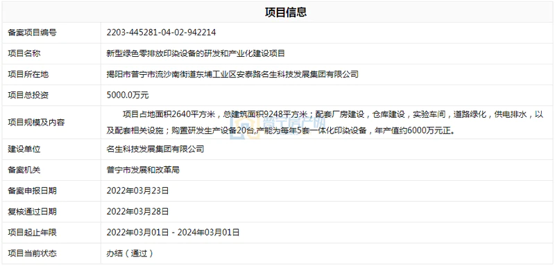 项目所在地:普宁市流沙南街道东埔工业区安泰路名生科技发展集团有限公司