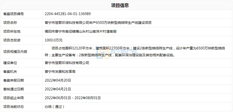 项目名称:普宁市楚君环保科技有限公司年产6500万块新型烧结砖生产线建设项目