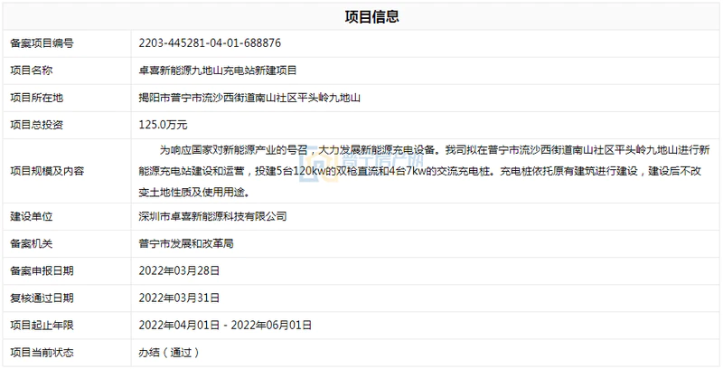 项目规模及内容:为响应国家对新能源产业的号召,大力发展新能源充电设备。我司拟在普宁市流沙西街道南山社区平头岭九地山进行新能源充电站建设和运营,投建5台120kw的双枪直流和4台7kw的交流充电桩。充电桩依托原有建筑进行建设,建设后不改变土地性质及使用用途。