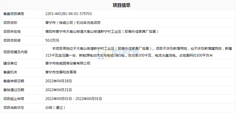 项目规模及内容:本项目用地位于普宁市流沙南街道泗竹埔村康美大道东侧。项目不涉及新增用地,也不涉及新增建筑物,新建新能源电动汽车充电桩4条8枪,总功率480千瓦,占地面积约300平方米,项目总投资约50万元,其中土建5万元,设备35万元;项目资金来源由建设单位自筹解决。顶目建设周期为2个月。计划开工时间2022年4月,计划竣工时间2022年5月。本项目位于普宁市流沙南街道泗竹埔村康美大道东侧。