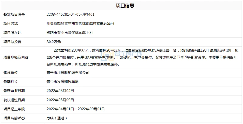 项目名称:川景新能源普宁市普侨镇乌犁村充电站项目