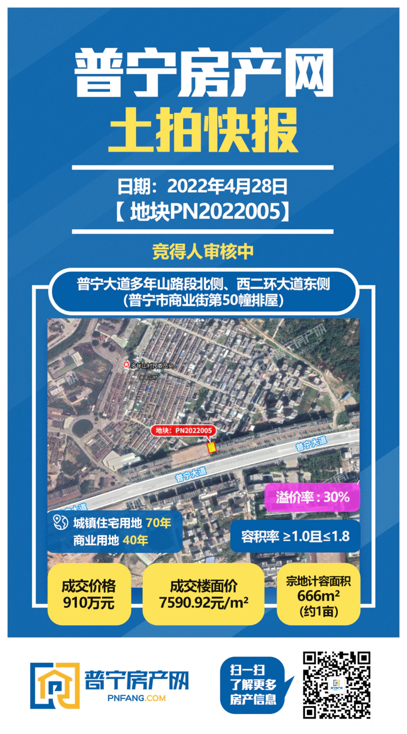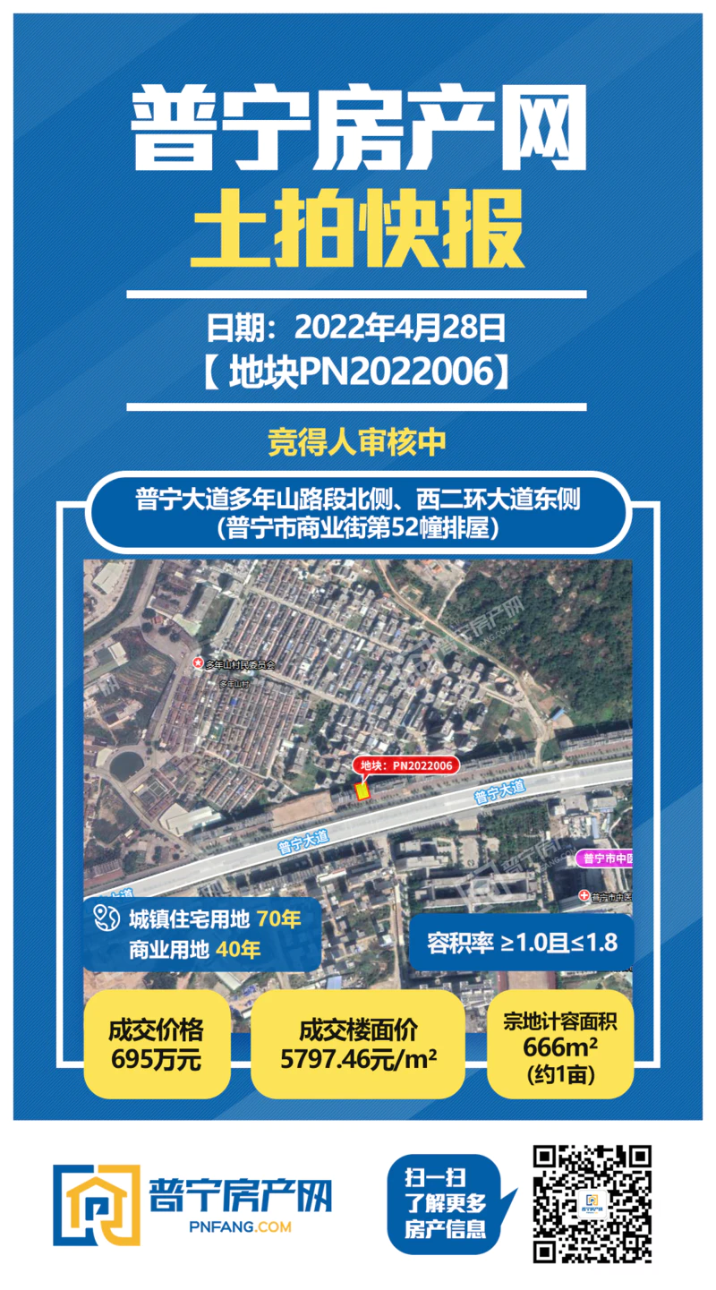 PN2022006地块以底价695万成交,成交楼面价5797.46元/㎡,地块位于普宁大道多年山村路段北侧、西二环大道东侧(普宁市商业街第52幢排屋),占地面积666平方米,为70年城镇住宅用地兼容40年商业用地。