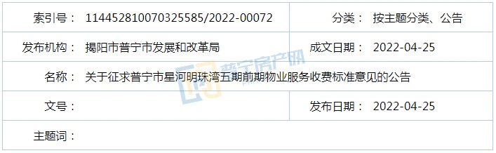 关于征求普宁市星河明珠湾五期前期物业服务收费标准意见的公告